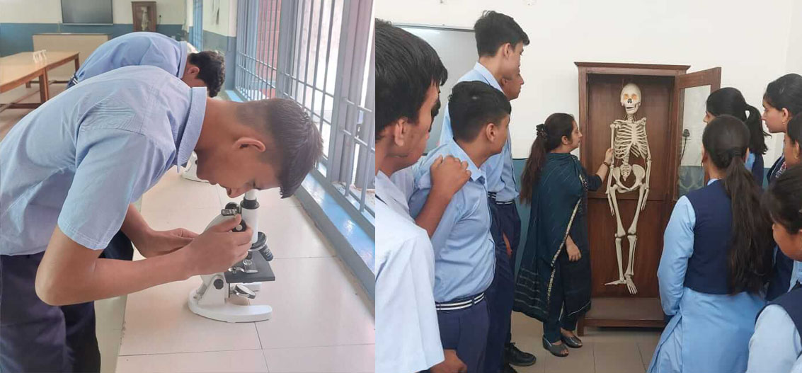 The lab also includes models of human anatomy, plant structures, and biological processes, enhancing students' understanding of complex concepts. Practical activities such as plant dissections, microorganism studies, and cellular observations reinforce theoretical knowledge while fostering scientific inquiry, critical thinking, and analytical skills.